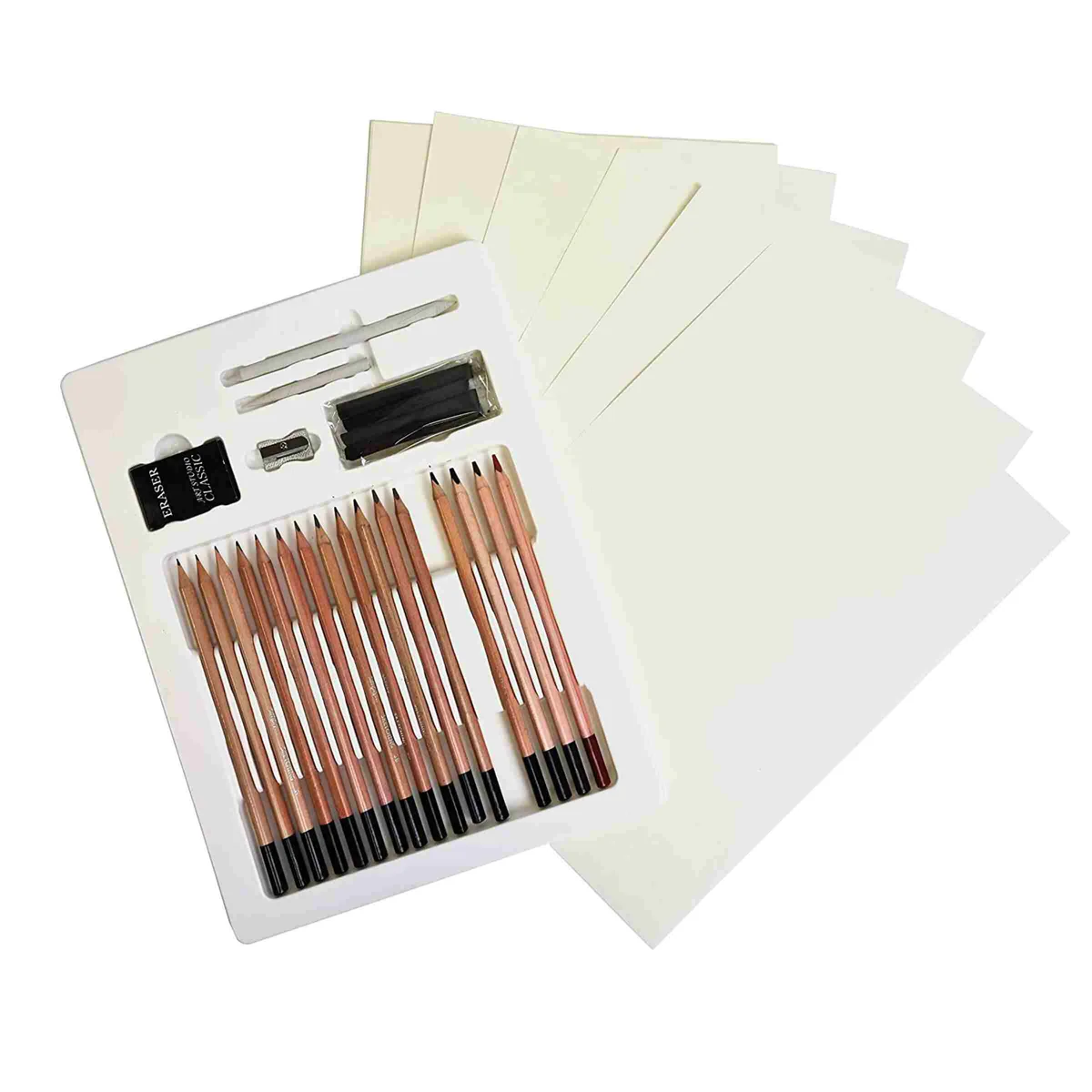 - Includes pencils, charcoal, erasers, and sharpeners