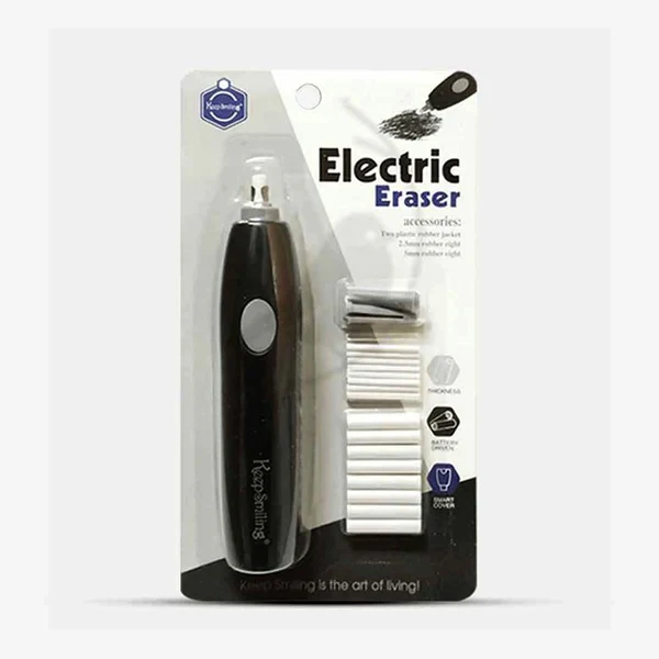 The Keep Smiling Electric Eraser offers convenience and precision in erasing tasks. Featuring a black plastic ergonomic frame measuring 118mm in length, 24mm in width, and 20mm in height, it provides comfortable handling during use. The removable metallic clamp securely holds the white eraser, ensuring stability and ease of replacement. Additionally, it comes with 30 alternative erasers, ensuring long-lasting usage. Powered by 2 x AAA batteries (not included), this electric eraser is battery-operated for portability and convenience. Its erasers are of a general global size (4mm x 25mm), with refills readily available at most major stationery stores.